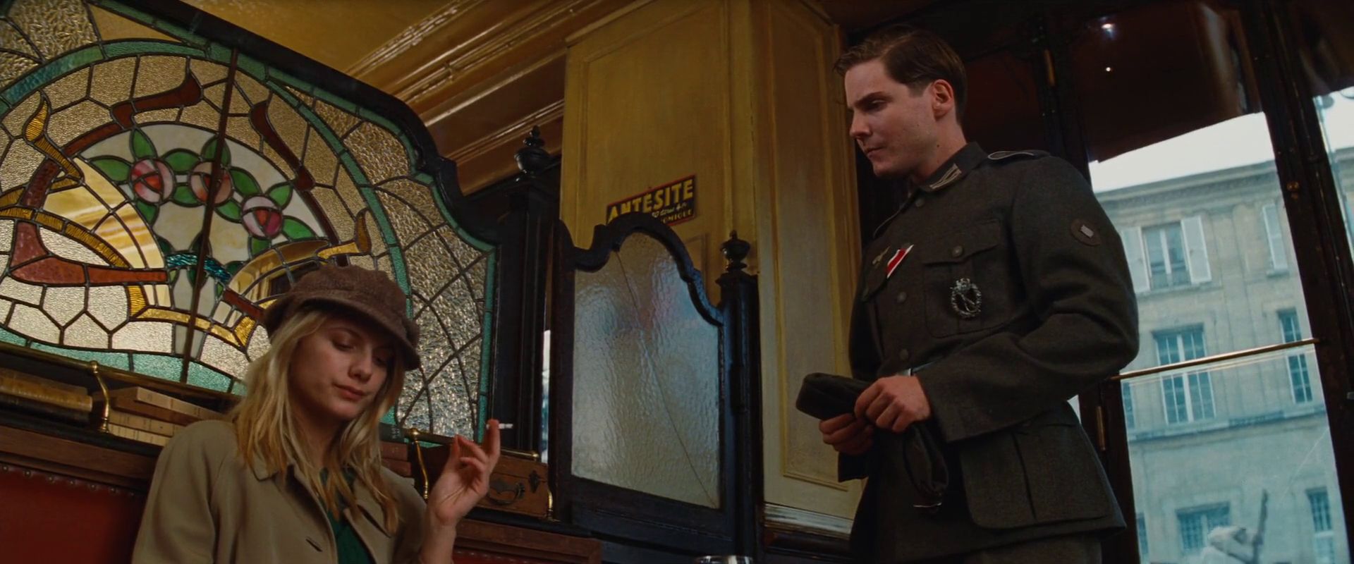 Daniel Brühl as Fredrick Zoller trying to make a connection with Shosanna Dreyfus (Mélanie Laurent.)